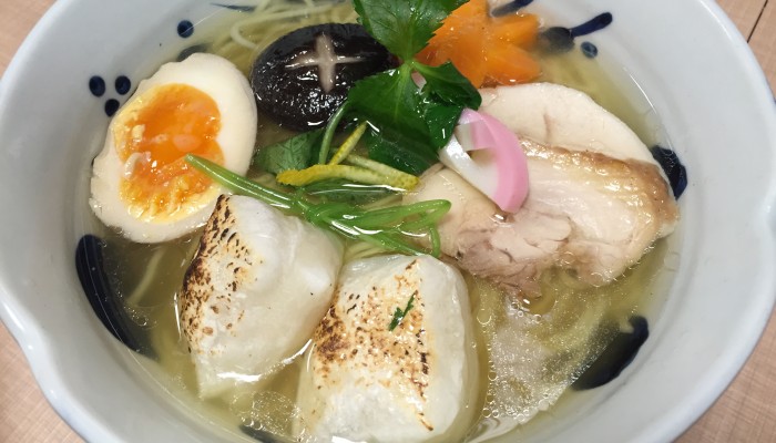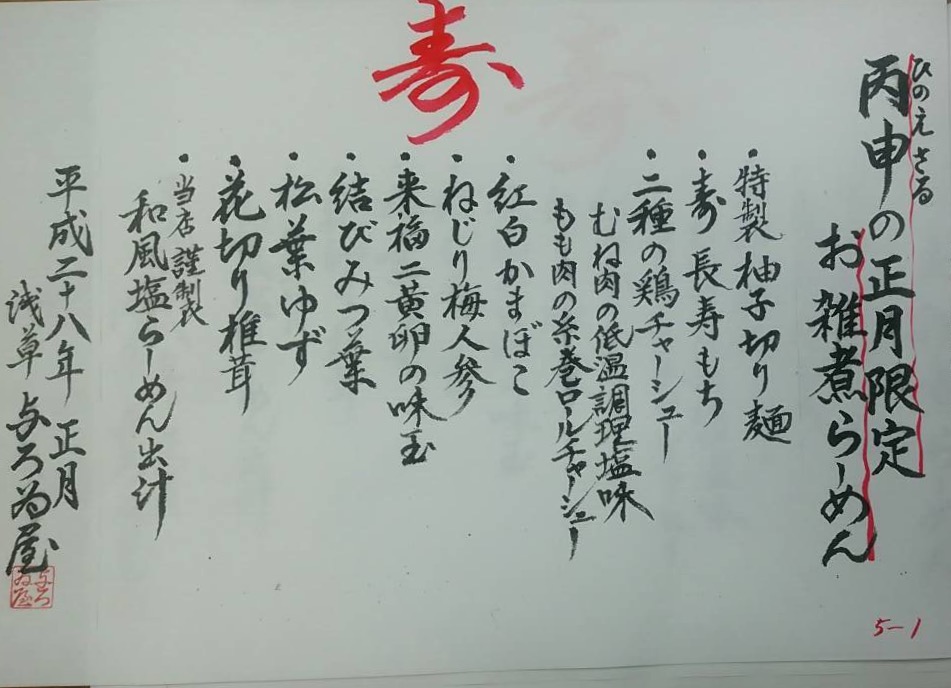 当店の塩らーめんをベースに焼き餅、2種類の鶏ちゃーしゅー、飾り人参、双子味玉、結び三つ葉と関東風のお雑煮スタイルに仕上げた一杯です。