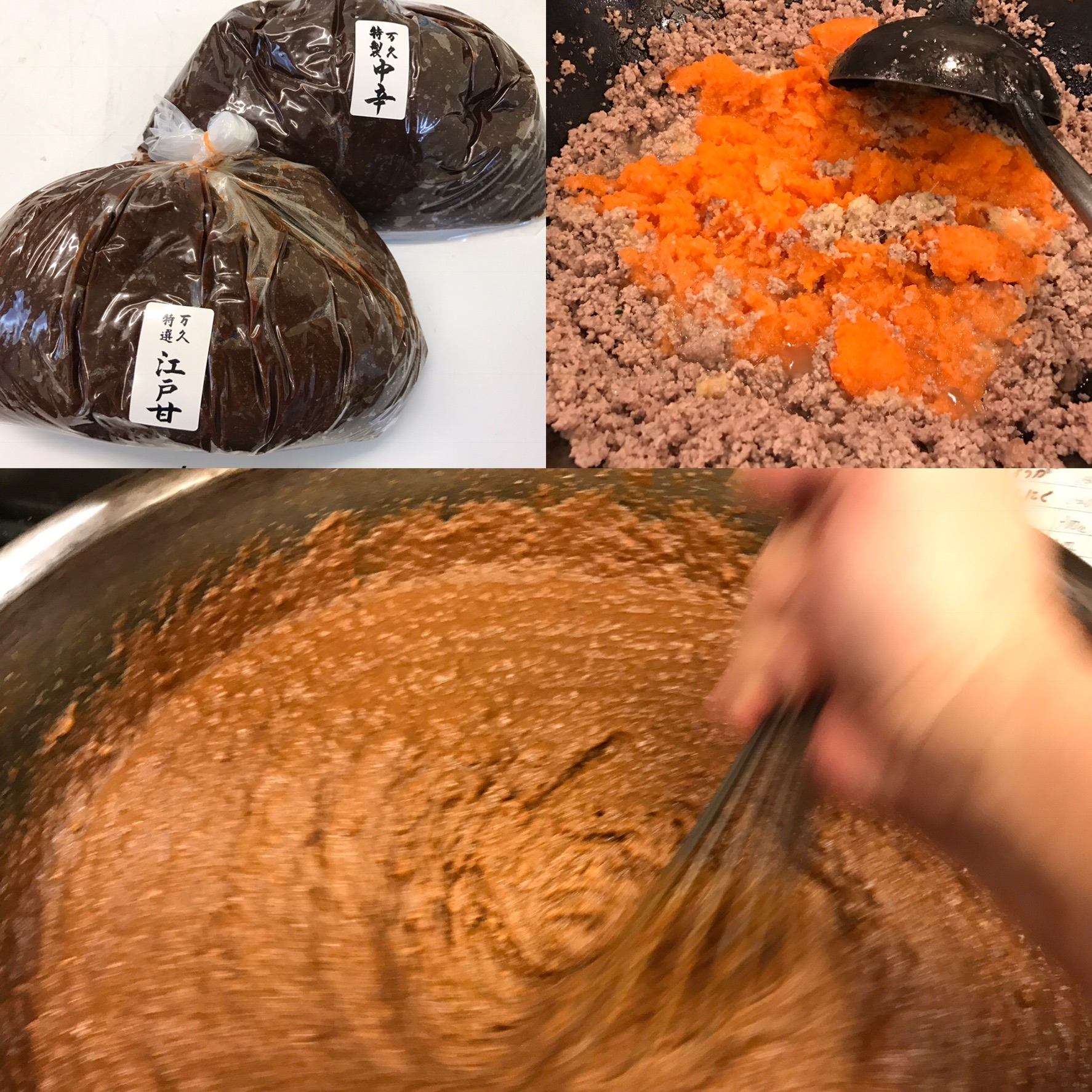浅草老舗の味噌専門店「万久味噌」さんの味噌をベースに数種類の味噌、そこに人参と玉ねぎをすりおろして、野菜の甘みも加えた、当店特製味噌だれです。