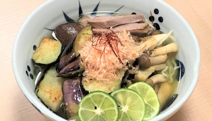 秋茄子とキノコに、すだちの風味でさっぱりと仕上げました。