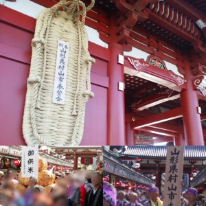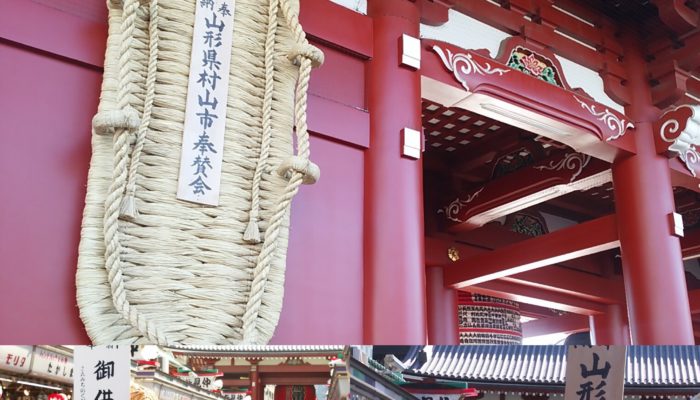 先日、山形県村山市による、浅草寺 宝蔵門の大わらじ奉納が行われました。浅草寺の宝蔵門に置かれる 大きなわらじが、仲見世を練り歩き、大勢の人で賑わいました。