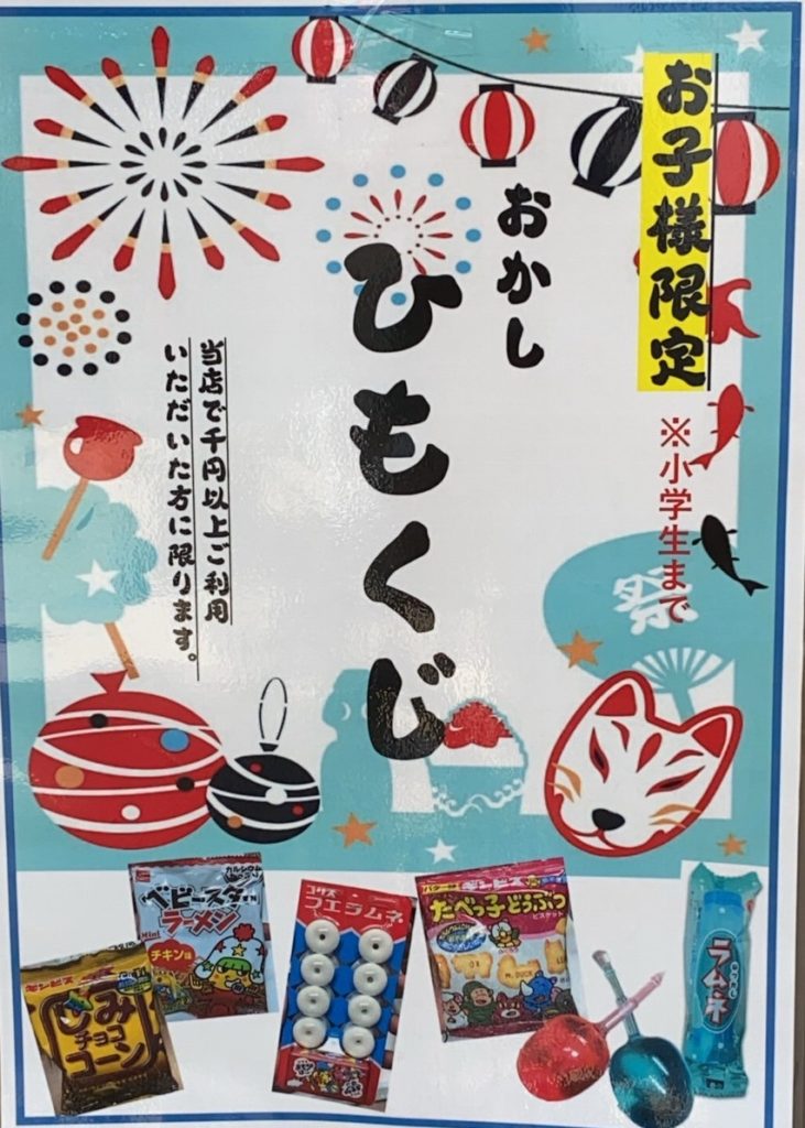 お子様連れ(小学生まで)のお客様、当店で千円以上ご利用の方に!お菓子のひもクジ1回プレゼント!