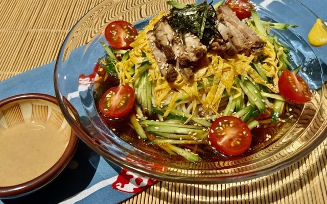 道のチャーシュー、きゅうり、錦糸玉子の具でシンプルに仕上げました。特製の胡麻ダレも使って味の変化をお楽しみください。